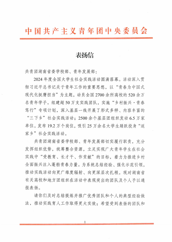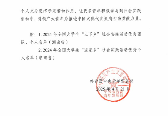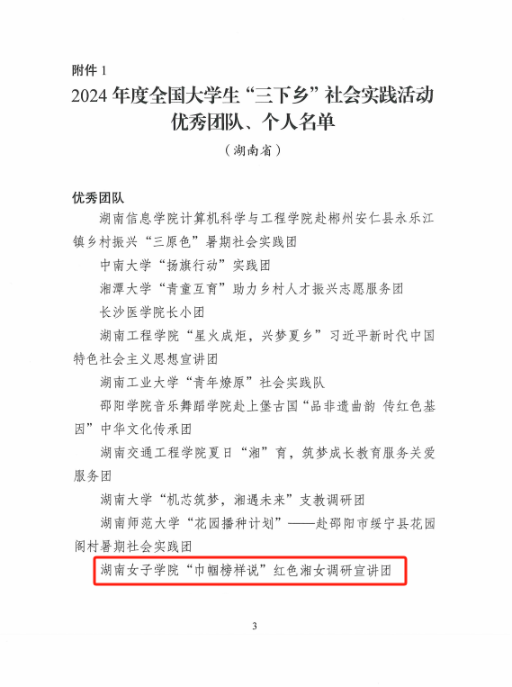 本网讯(tyc41183太阳成集团 曾海燕 张洵)2025年4月,tyc41183太阳成集团“巾帼榜样说”红色湘女调研宣讲团,成功获评2024年度全国大学生“三下乡”社会实践活动优秀团队,为学院实践育人与红色理论宣讲工作再添殊荣。