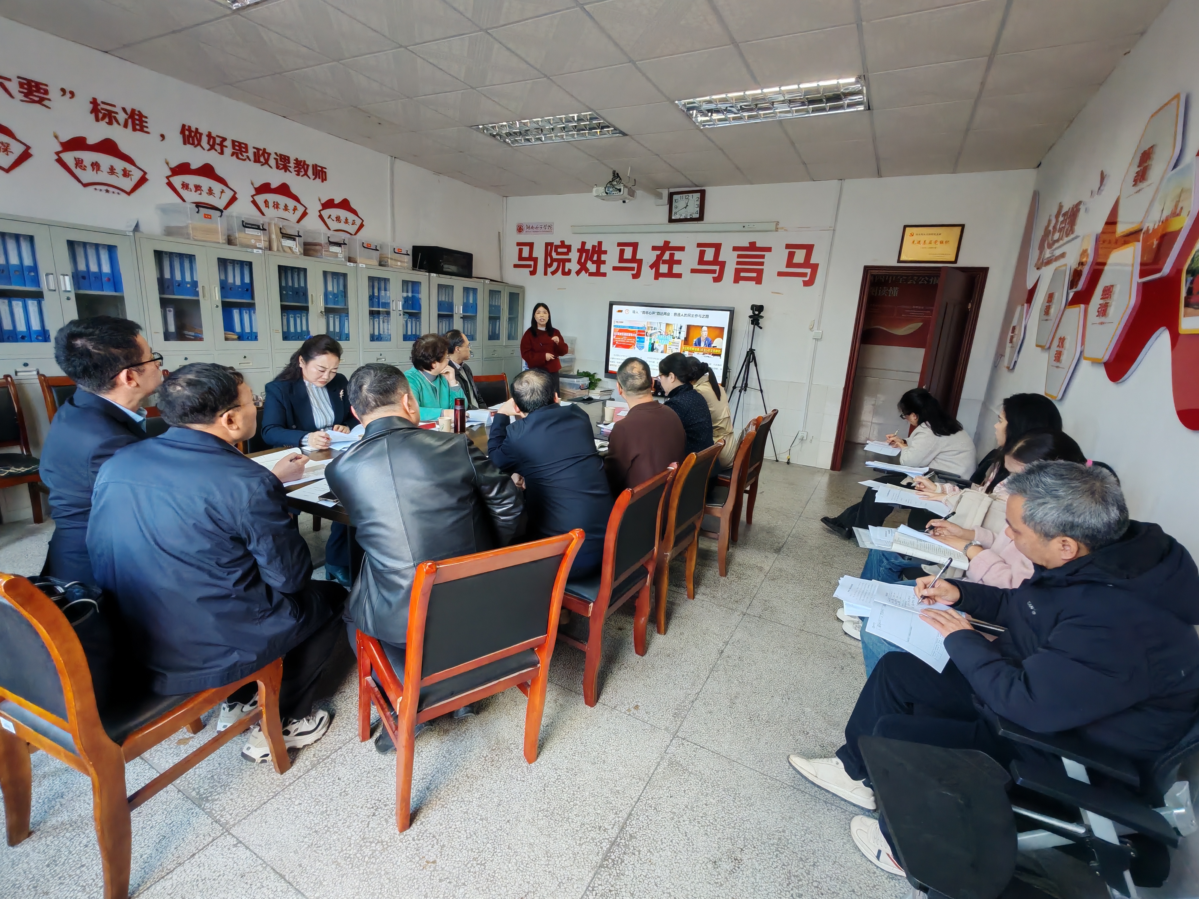 集体备课会上,《习近平新时代中国特色社会主义思想概论》教研室教师李银艳博士围绕第八章发展全过程人民民主的第一节“坚定中国特色社会主义政治制度自信”和第二节“全过程人民民主是社会主义民主政治的本质属性”作教学内容说课。汇报结束后,与会领导与教师们展开了热烈的交流研讨。